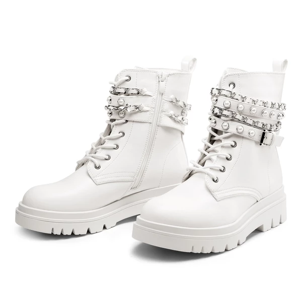 - Punk Style: These chunky lug sole ankle boots are embellished with silver chains & pearl-studded straps, making them perfect for those who want an edgy style with added glam.