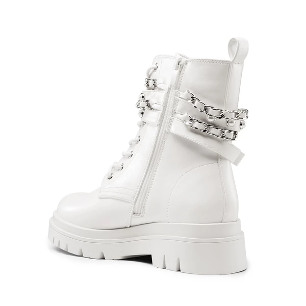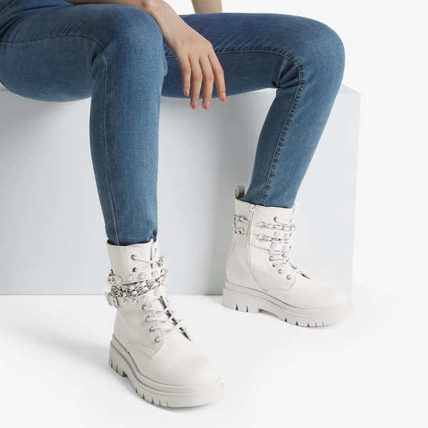 Show off your attitude with our punk styled chunky lug sole boots, embellished with silver chains and pearl-studded straps. Including a smooth side zip and comfortable latex insoles.