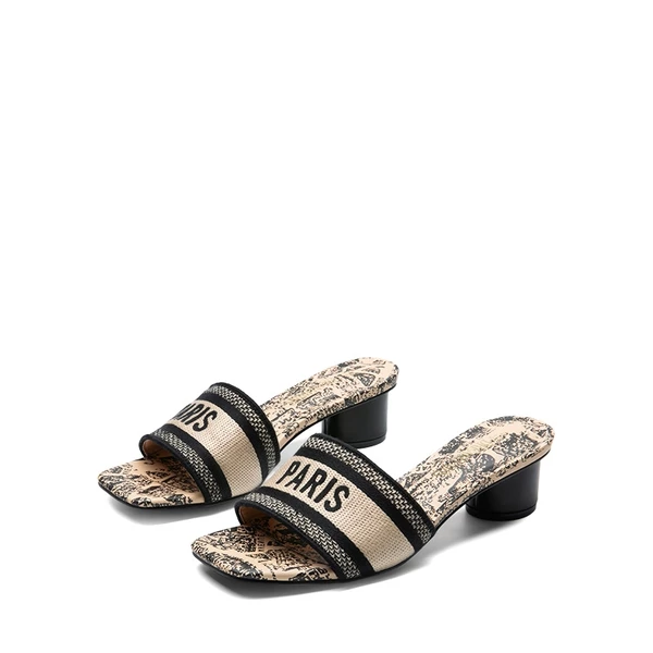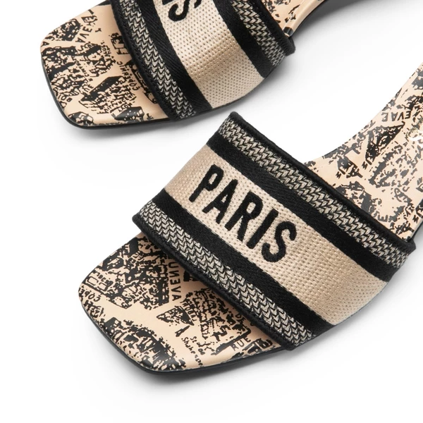 These slide heel sandals are a must-have in any closet. Featuring a jacquard strap and modern cylindrical heel these sandals are easy to wear and match easily with any outfit. From casual outings to dressed-up affairs, these heeled slide sandals effortlessly elevate your look with their versatile silhouette and timeless appeal.