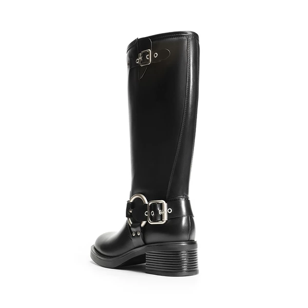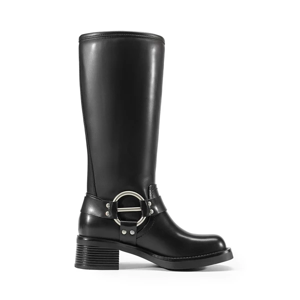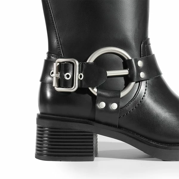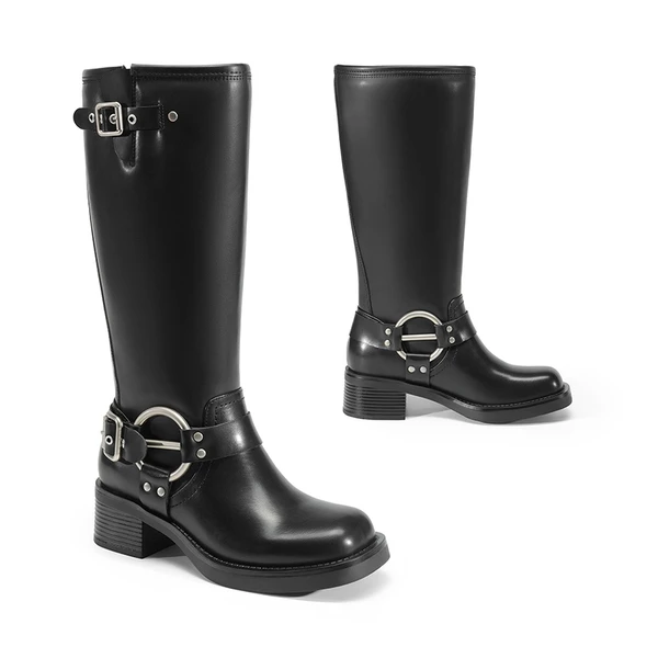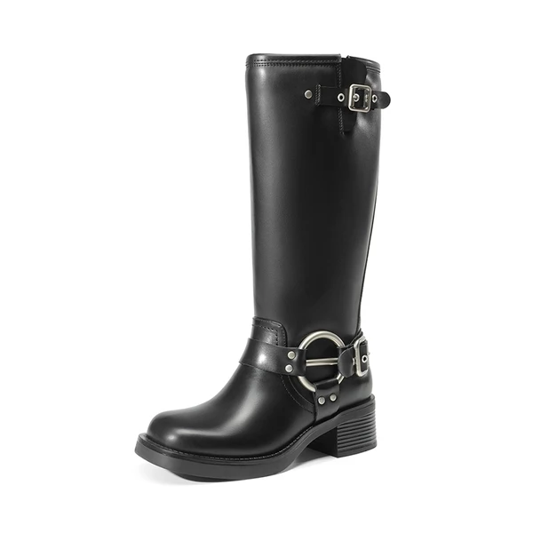 These women’s knee-high motorcycle boots feature a chic and contemporary design with a rounded toe and stylish belt buckle embellishments.