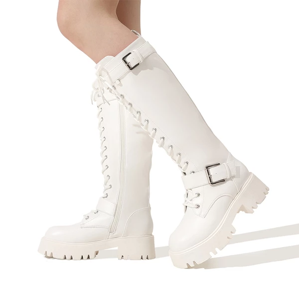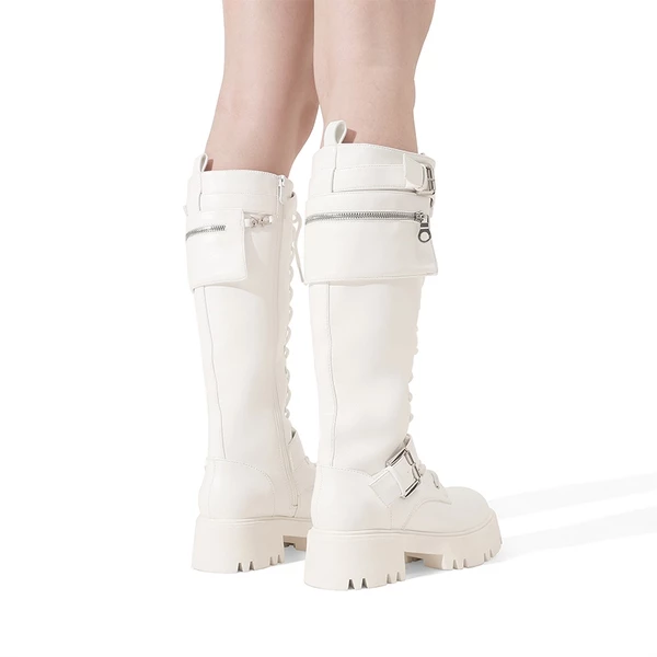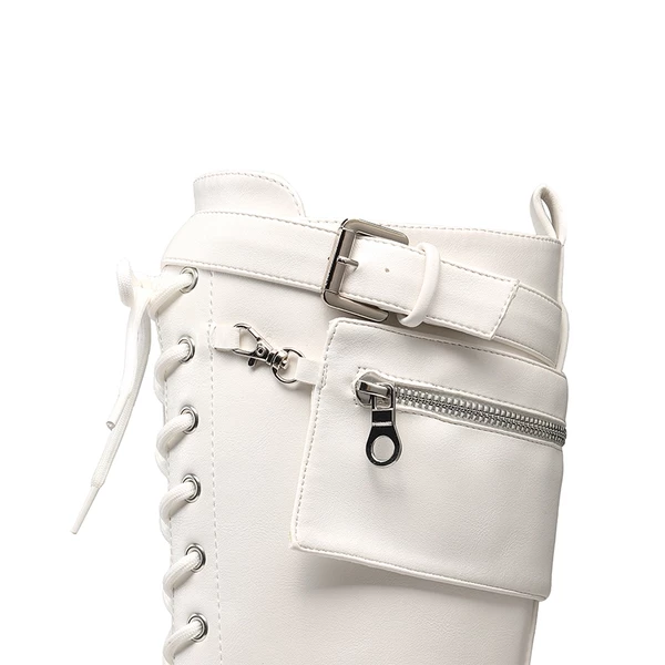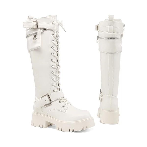 Complete a cool and edgy style with these lug-sole platform boots with metallic elements. Designed with a removable side pocket where you can store your small valuables while elevating your outfit. Pair these knee-high boots with your shorts, leggings, jeans, or other outfits in your wardrobe for a fashionable high-street look.ย