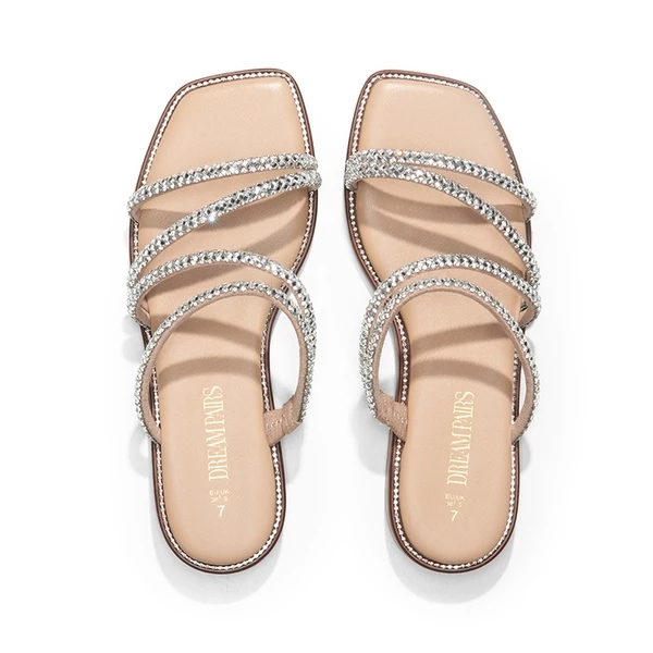 - Rhinestone Straps: Elevate your style with these women’s rhinestone slide sandals featuring an asymmetric sparkly strappy rhinestone upper and studded edge, perfect for showcasing your trendy looks.