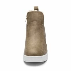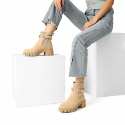 - The mid heel chunky ankle boots are available in colors of Black, brown, tan, taupe and grey.