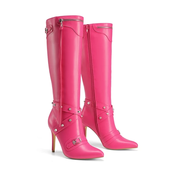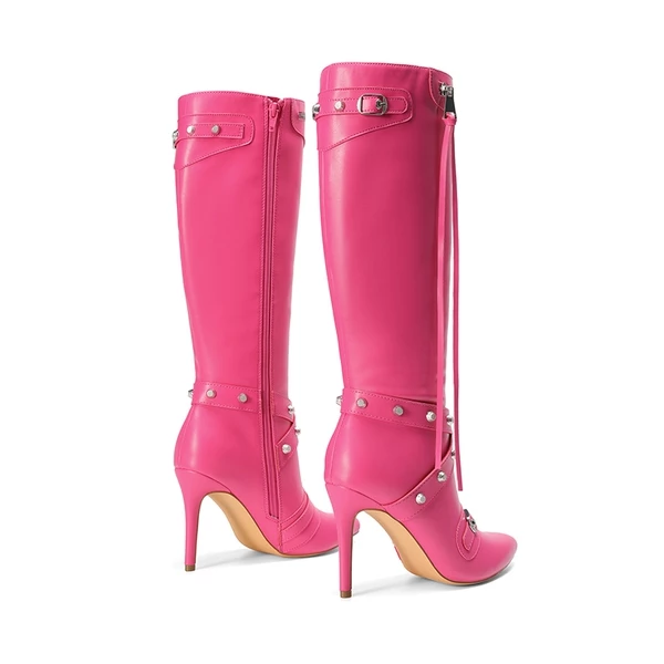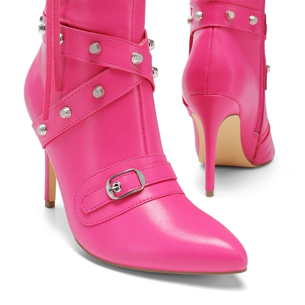 Studded Cross-over Strap Stiletto Heel Boots HOT PINK